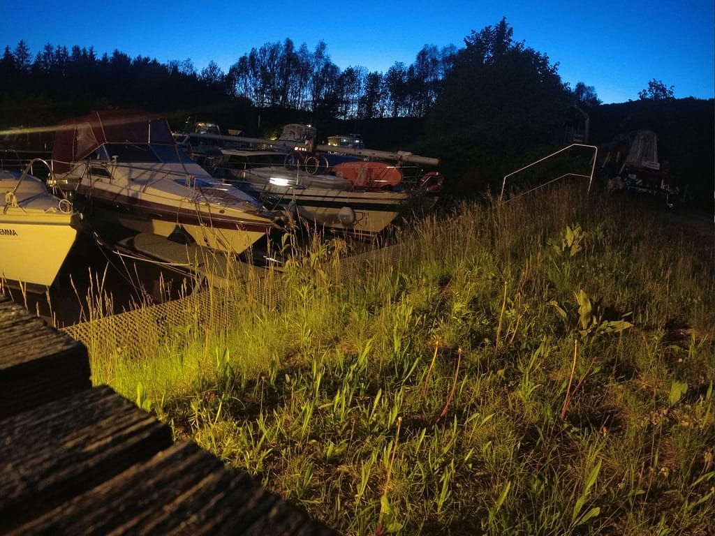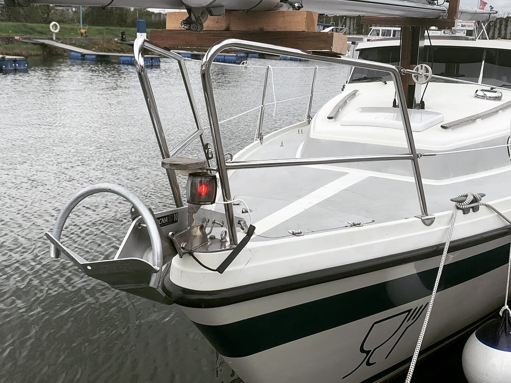 Leine an der Mittelklampe ist bereit? CHECK! Fender hängen draußen? CHECK! Also schön langsam rein in den Hafen. Zur Rechten arbeitet ein Herr des Sportklubs fleißig an seinem Boot, „Guten Tag“! Nach links um die Kurve und da ist auch schon der besagte Anlegesteg an Steuerbord. Oh, direkt vor der Sliprampe, aber der Hafenmeister hat ja bestätigt, dass der Platz für uns mehr als ausreichend ist. Also schön in Ruhe anfahren…
